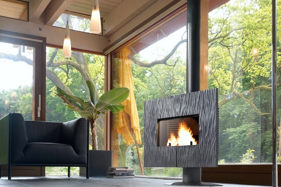 Часто каминные печи облицовывают камнем или керамикой, но особенно популярны модели, обыгрывающие эстетику металла, как в чистом виде, так и окрашенные в различные цвета.