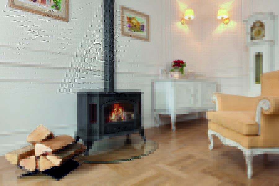 Но многие минусы можно обратить в плюсы при использовании современной «начинки» — каминной топки. Они изготавливаются из чугуна, стали, композитных материалов, оснащаются выдвижными или съемными зольниками, что облегчает уход за камином. Закрытая каминная топка имеет очень высокий КПД, а для получения количества тепла, аналогичного открытому камину, нужно почти в 3 раза меньше дров, которые сгорают практически полностью.