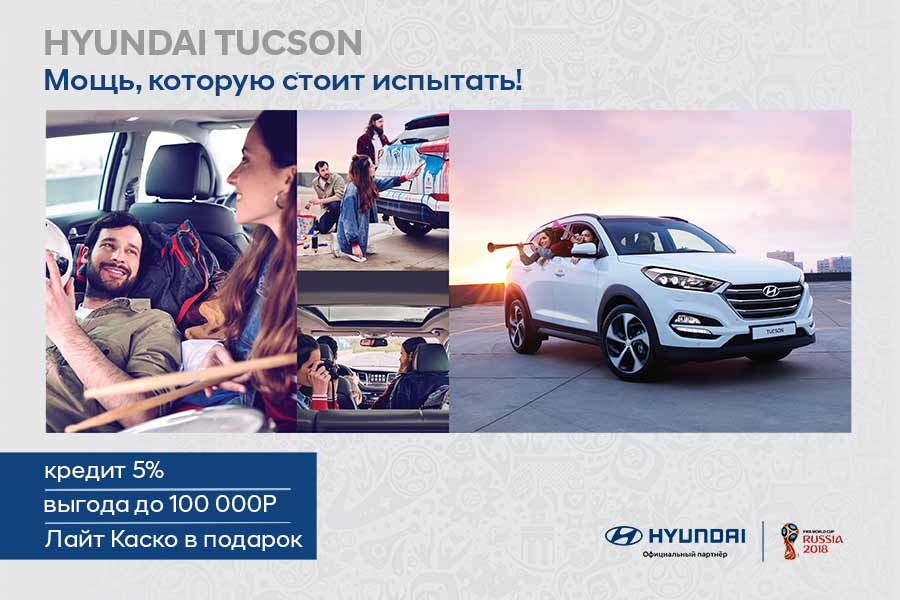 Яркий и вместительный кроссовер Tucson предложил покупателям следующее специальное предложение: Лайт Каско в подарок, кредитная ставка 5% и выгода до 100 000 рублей до конца июня 2018 года.