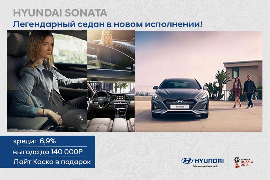 Легендарный седан в новом исполнении, Hyundai Sonata, получил выгоду до 140 000 рублей, лайт каско в подарок и кредитную ставку от 6,9% годовых. Выгодное предложение суммируется из 80 000 рублей - по программе лояльности "Мир Хёндэ", до 20 000 рублей - при сдаче своего Hyundai по программе Trade In для клиентов Hyundai, до 40 000 рублей по Trade In для клиентов Hyundai от дилерского центра