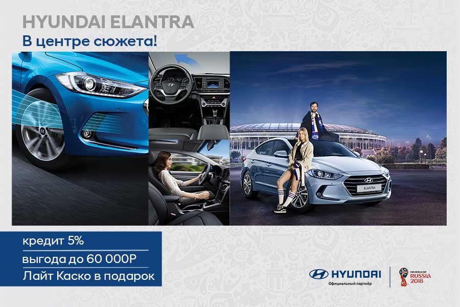 Элегантный седан Hyundai Elantra также может порадовать интересными специальными предложениями на июнь, в преддверии Чемпионата: Лайт Каско в подарок, кредитная ставка 5% и выгода до 60 000 рублей до конца июня 2018 года.