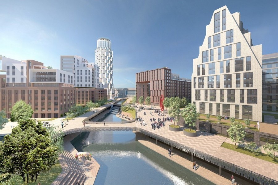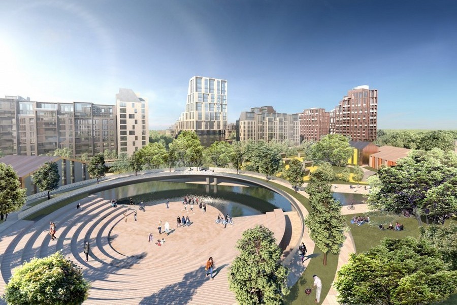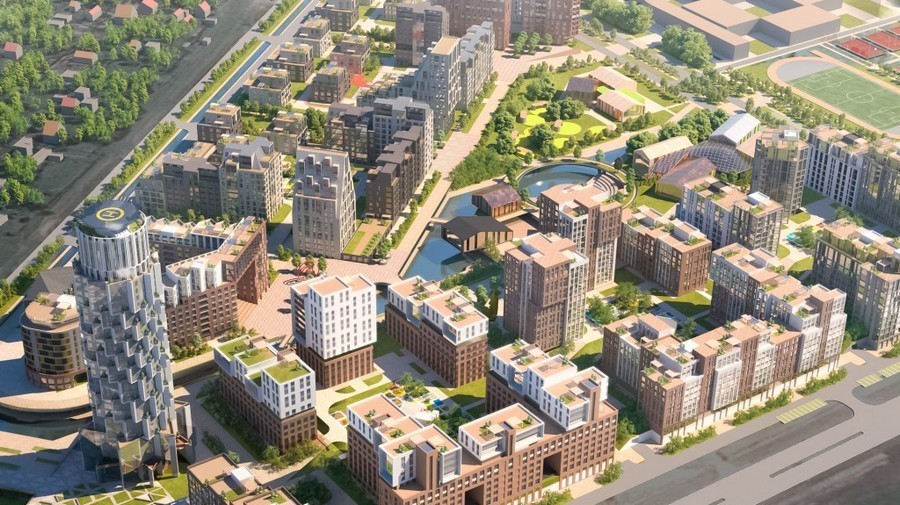 Решения с каскадами прудов, водяным экраном открытого кинотеатра, уютными набережными, воздушными мостами, галереями и парком — это только малая часть общественных пространств проекта. Культурная часть — библиотеки, открытые театры, кинозалы. Образовательная — две школы (на 1700 и на 400 мест), детсад и студии «по интересам».