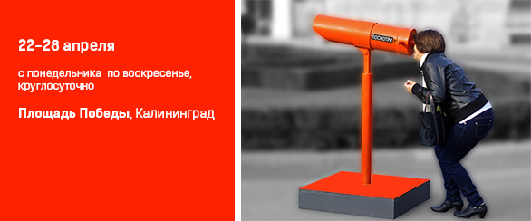 Представители прибрежных регионов оригинально представят жителям Калининграда красоту южной части Балтийского моря. Они буквально перенесут часть приморских развлечений вцентр Калининграда. Все это осуществится спомощью подзорной трубы, которая 22апреля будет установлена наплощади Победы. Глядя внее, можно будет почувствовать атмосферу прибрежных туристических городов исобственными глазами убедится втом, что ихстоит посетить. Мыодновременно окажемся инапольском пляже, инанемецком или литовском курорте. Более того, можно выиграть отличные призы— программы выходного дня вроскошных отелях.