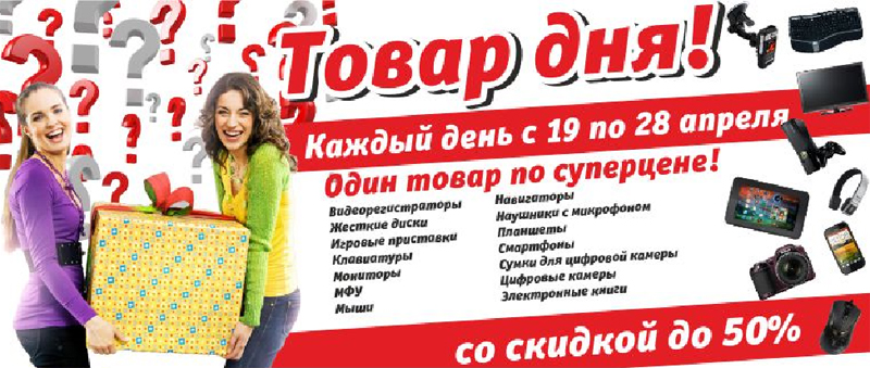 Товаром дня может стать: видеорегистратор, навигатор, игровая приставка, монитор, МФУ, планшет или смартфон, цифровая камера, электронная книга и многое другое… Скидки до 50%! Подробности акции «ТОВАР ДНЯ» в салонах «Сохо» города Калининграда и области!