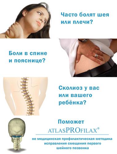Если у человека есть проблемы с позвоночником, шеей, головными болями или проблемы со спиной, то, с точки зрения специалиста по методике «АтласПрофилакс», необходимо уладить основную причину такой ситуации — исправить подвывих атланта (первого шейного позвонка). После устранения подвывиха атланта тело включает процессы самовосстановления, поскольку пропадает необходимость в таких неестественных «приспособлениях» как сколиоз, нестабильность шейного и поясничного отделов позвоночника, повышенное артериальное давление и т. д.