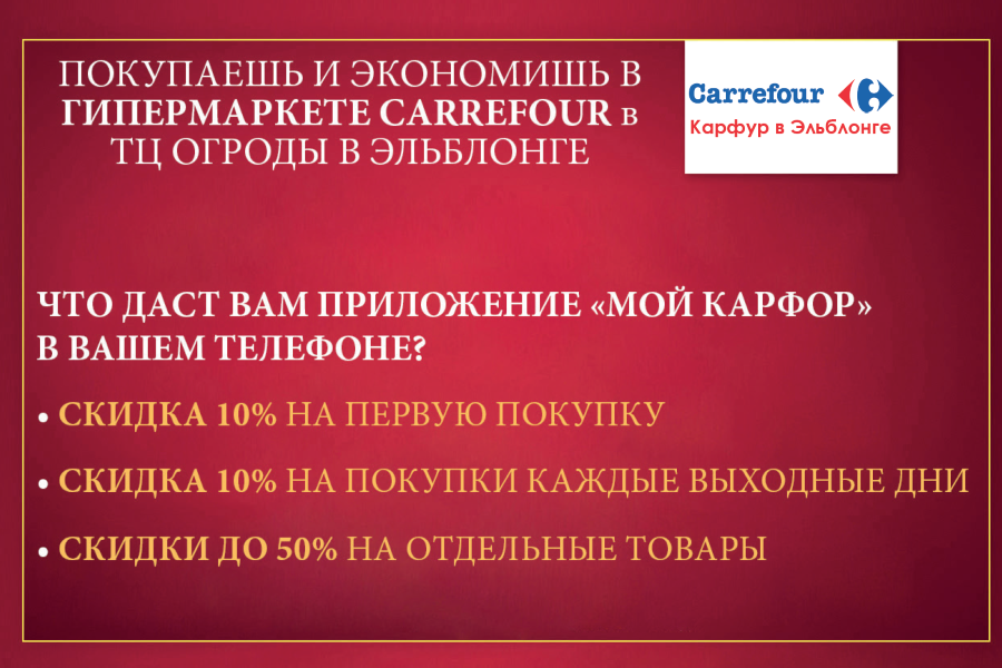Один из крупнейших гипермаркетов вблизи границы решил предложить соседями из Калининградской области более широкий доступ к мобильному приложению «Мой Карфур», которым массово пользуются поляки, экономя на покупках действительно большие деньги. Благодаря приложению в вашем телефоне, с пятницы по воскресенье каждый клиент получит 10% скидки на все покупки. В приложении имеются также специальные купоны со скидками — 50%. И дополнительно россияне в эльблонгском Carrefour получают полный возврат НДС, то есть 23%, в рамках системы Tax Free. Регистрация бесплатного приложения чрезвычайно проста. Вы можете скачать его как на телефон с Android (Google), так и на iPhone (App Store).