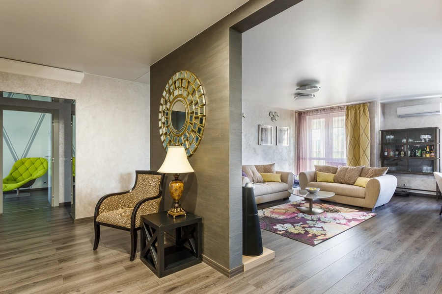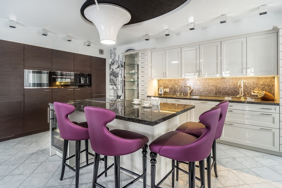 Для модерновых интерьеров, которым присущи плавные линии, применяются потолки с переходом уровня. С помощью этого варианта можно скруглить углы, выполнить в помещении изогнутые линии или лекальные формы. Дополнить такую идею можно точечными светильниками, делающими акцентное дополнительное освещение.