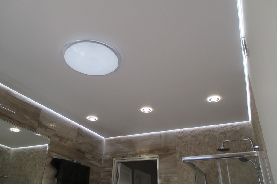 Для этого направления можно использовать скрытые подсветки с диодными лентами в виде «парящих» потолков и потолочных фонарей. Тогда диодные ленты прячутся за натяжным потолком, и человек видит рассеянный свет. Подробнее почитать про исполнение натяжных потолков в стиле