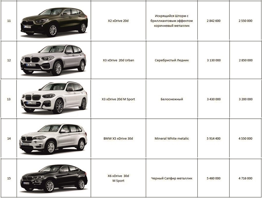 *Акция «привилегии не для всех» (далее — Акция) действует с 16.10.2018 по 31.10.2018. Предложение распространяется на выделенный модельный ряд автомобилей и других товаров при условии их наличия. Сумма выгоды и размер скидки определяются в зависимости от конкретного автомобиля или товара, не суммируются с акциями и скидками по другим программам. Количество автомобилей и товаров, участвующих в Акции, ограниченно. Подробные условия Акции — на сайте www.bmw-rusmotors.ru. Предложение не является офертой.