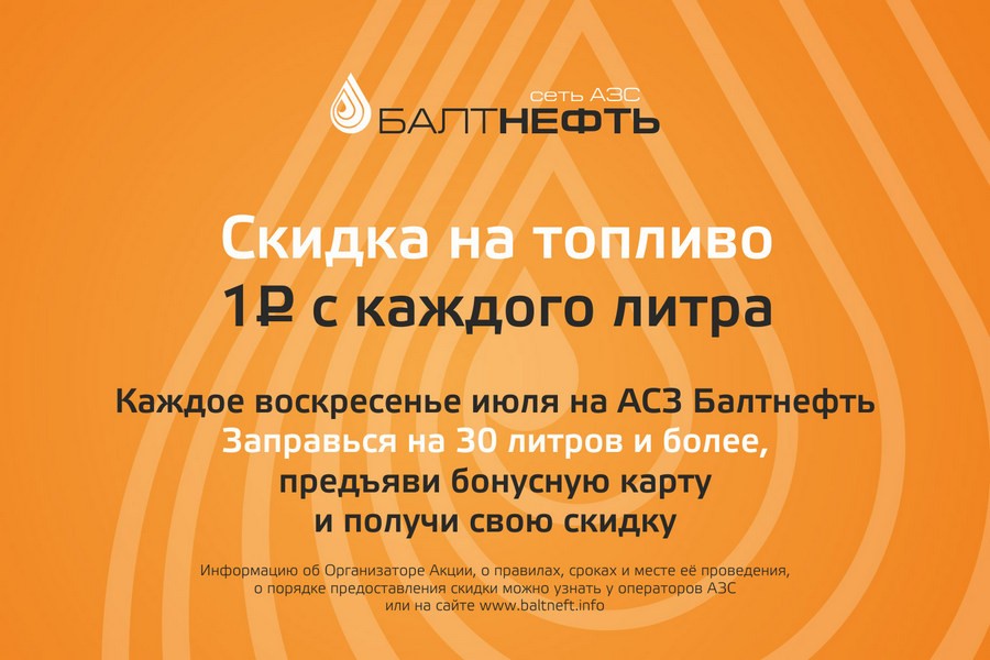Мы дарим скидку на каждый литр в размере 1 рубля всем, кто заправит свой автомобиль в воскресенье на 30 литров и более любым видом топлива с использованием карты лояльности «Балтнефть». Если же вы не являетесь держателем нашей бонусной карты, а получить воскресную скидку на топливо очень хочется, то оформить карту можно сразу на АЗС. Накапливая бонусные баллы, вы сможете полностью оплачивать ими как топливо, так и любой сопутствующий товар в магазинах на АЗС. Хотим также обратить ваше внимание на свежесваренный зерновой натуральный итальянский кофе и продукцию кафе. Всё для вас, наши дорогие друзья! Также в мини-маркетах АЗС «Балтнефть» действуют регулярные скидки и постоянно проходят интересные акции.