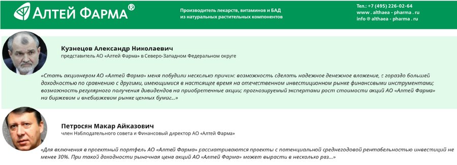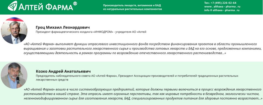 — Общая информация о компании и реализуемых ею проектах есть на сайте самого АО «Алтей Фарма». Специализированную информацию можно найти на сайте Сообщества миноритарных акционеров.