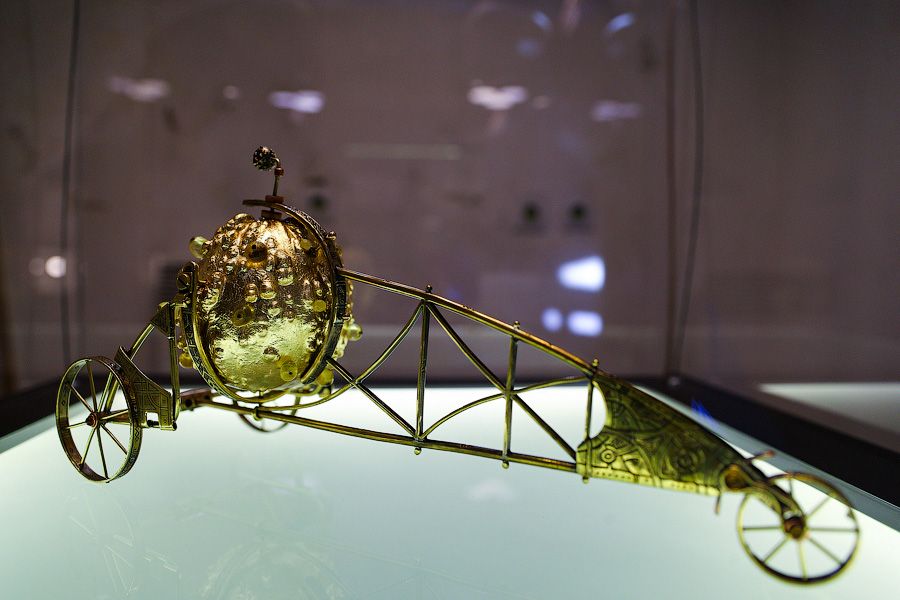 Эта солнечная машина выполнена в основном из латуни, а янтарь здесь выступает, видимо, как источник энергии. Все детали у модели — движущиеся. Таким образом, этот объект соответствует заявленной номинации и рождает разнообразные представления об атрибутах фантастического театрального действия.