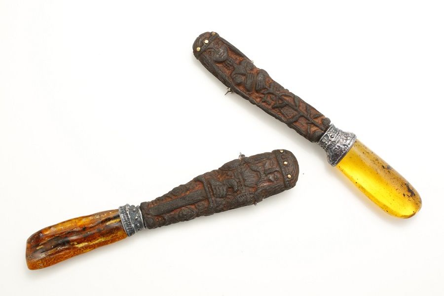 янтарь, ясень, чёрное дерево, зуб кашалота, металл, стразы, китовый ус