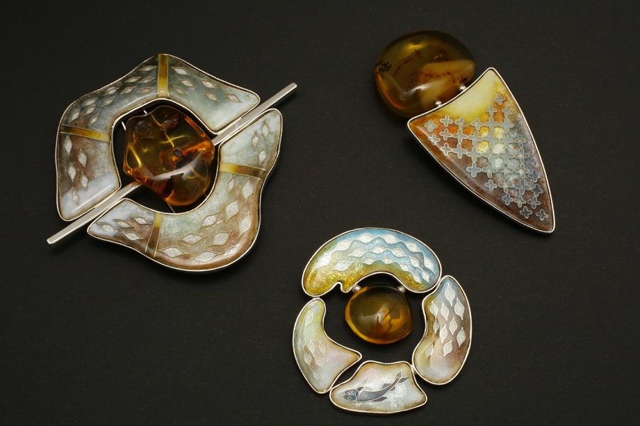 Автор подала эти броши в номинацию «Мастерство». И мастерство здесь великолепно: в обработке, в подборе цветов и, конечно, в представленных образах. Пластины серебра, покрытые эмалевыми узорами, впечатляют своей живостью: как будто бы это мягкая органическая плоть плывущих в воздухе или воде фантастических существ. По форме броши напоминают цветок: у каждой есть серединка и фантастическая юбочка из лепестков, — но образы не назидательны, они предполагают очень широкий смысловой диапазон в трактовке. И, конечно, они очень хорошо, мастерски сделаны. Жюри отдало «Триптиху» гран-при единогласно.
