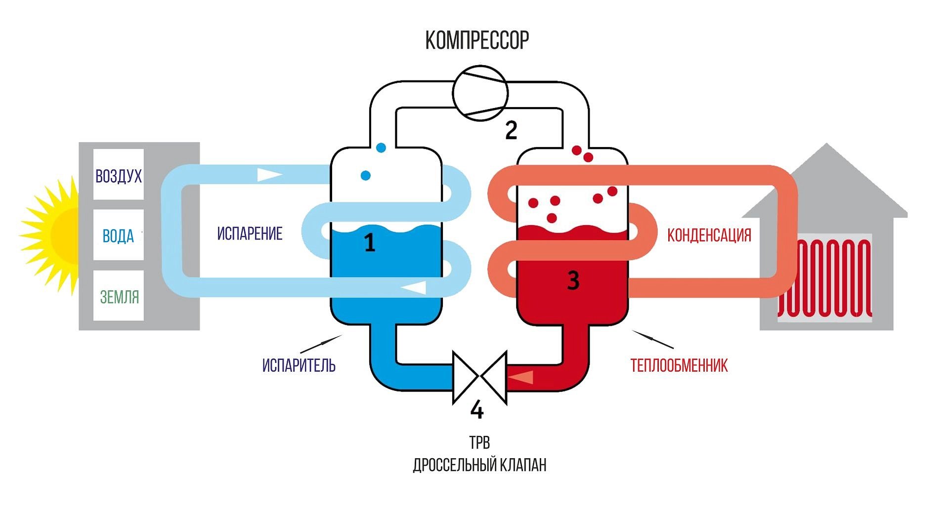 Фреон в жидком состоянии забирает тепло из воздуха/земли/воды и переходит в газообразное состояние. После кипящий фреон попадает в компрессор, где под давлением выделяет ещё больше тепловой энергии. В теплообменнике полученное тепло передаётся воде в системе отопления, и нагревается бак для горячей воды. Далее — давление понижается и фреон снова переходит в жидкое состояние. Цикл повторяется.