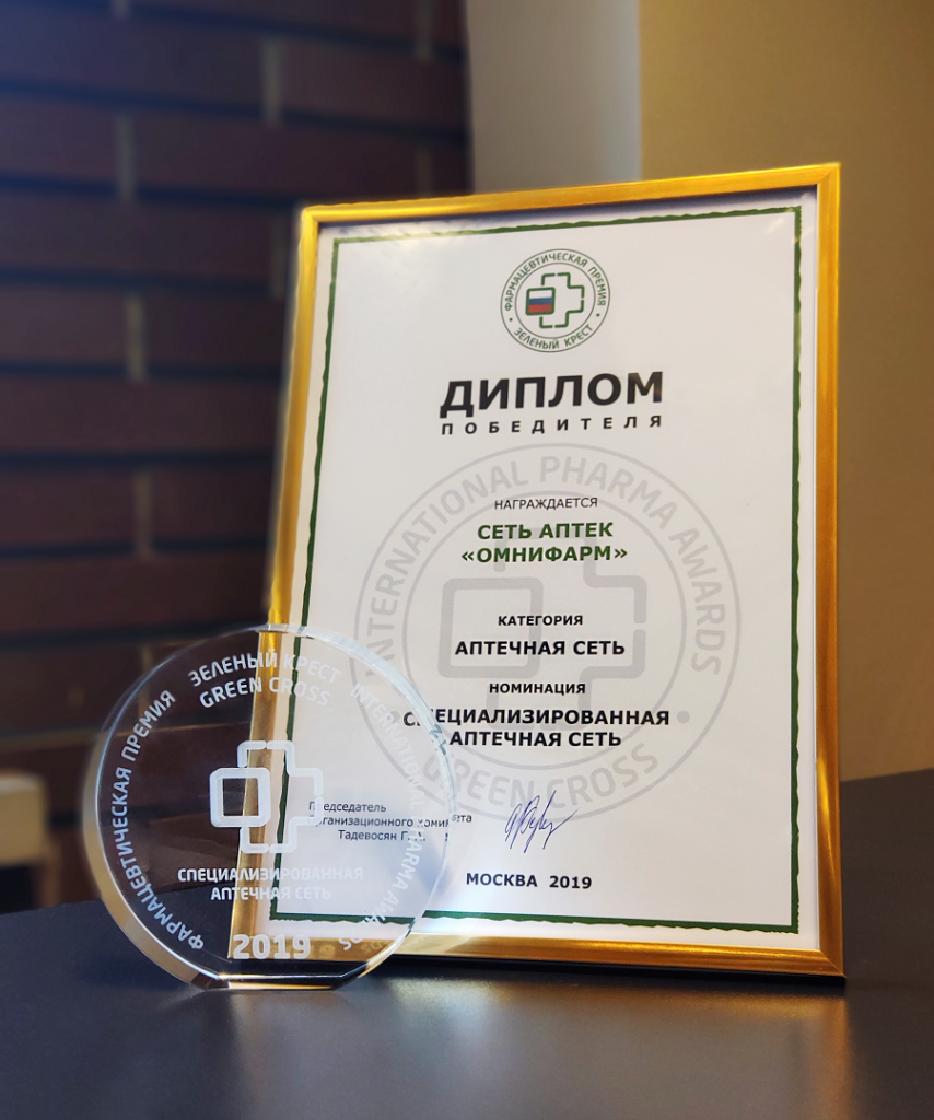 В 2019 году аптечная сеть «Омнифарм» стала победителем в номинации «Специализированная аптечная сеть» международной фармацевтической премии «Зеленый Крест».