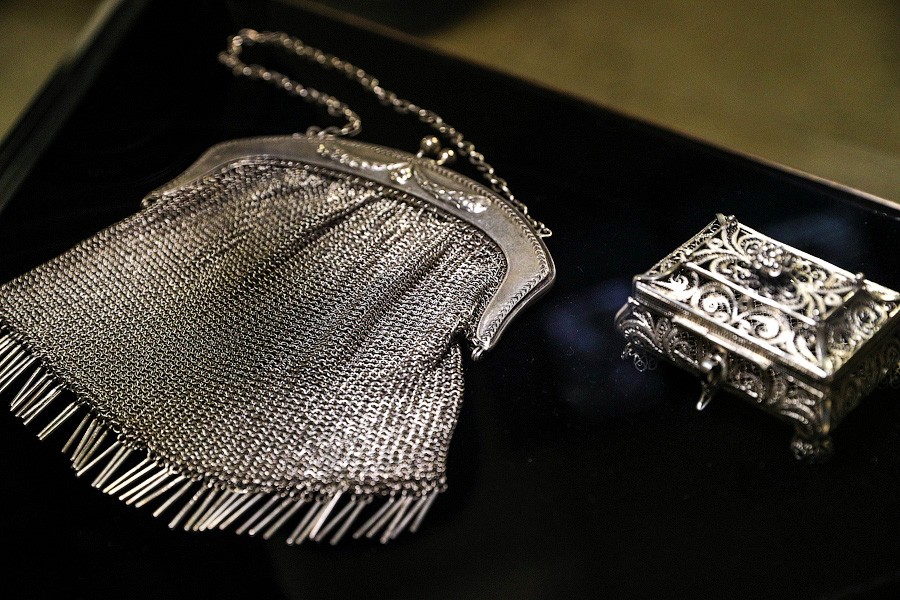 Предметы светского характера на выставке в Музее янтаря представлены ювелирными украшениями, портсигарами, принадлежностями для письма, столовым серебром — от конфетниц до вилочки для шпрот (так была популярна эта рыба). Один из самых примечательных экспонатов — дамская театральная сумочка конца XIX века. Крошечные серебряные колечки сплетены по принципу кольчуги в аксессуар, места в котором хватает как раз для того, чтобы положить бинокль и кружевной платочек.