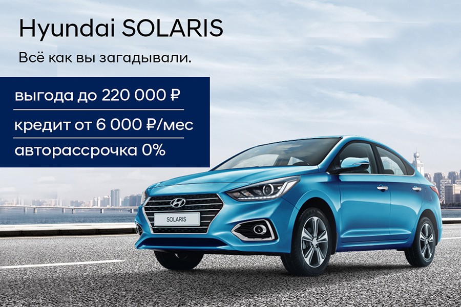 **Действие программ «Первый автомобиль» и «Семейный автомобиль» распространяется на новые автомобили Hyundai Solaris и Creta 2019/2020 года выпуска стоимостью до 1 000 000 рублей. Для участия в программе «Первый автомобиль», клиенту необходимо соблюсти одновременно следующие условия: 1. не иметь ранее в собственности автомобиль и оформленные автокредиты. 2. обладать водительским удостоверением, 3. не заключать в 2020 году иных кредитных договоров на приобретение автомобиля, 4. кредит должен быть выдан в рублях РФ. Для участия в программе «Семейный автомобиль» клиенту необходимо соблюсти одновременно следующие условия: 1. клиент имеет 2-х или более несовершеннолетних детей (до 18 лет), что подтверждается отметками в паспорте или предоставлением оригиналов свидетельств о рождении каждого ребенка, в том числе находящихся под опекой или на попечительстве, включая приемных, 2. иметь водительское удостоверение, 3. не иметь оформленных автокредитов на покупку автомобиля в 2019 году и не заключать в 2020 году иных договоров на приобретение автомобиля, 4. кредит должен быть выдан в рублях РФ. Оформление кредитов по программам доступно через банки партнеры — ПАО «Совкомбанк» (Генеральная лицензия ЦБ РФ№ 963 от 05.12.2014 года), ООО «Сетелем банк» (Генеральная лицензия ЦБ РФ № 2168 от 27 июня 2013 г., и ООО «Русфинанс банк» (Генеральная лицензия ЦБ РФ № 1792 от 13.02.2013 г ).