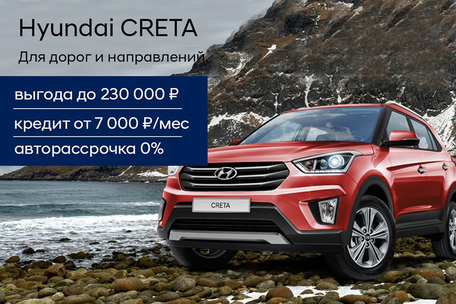 Hyundai Creta — флагман продаж в линейке кроссоверов Hyundai. Надежный стальной каркас из высокопрочной стали, современный дизайн, хороший комфорт сделали этот кроссовер поистине любимцем покупателей.Предложение на компактный кроссовер Hyundai Creta до 16 марта составит до 230 000 рублей. Кредит по программе Старт составит от 7 000 руб./мес., и беспроцентная авторассрочка по карте «Халва» также действует на данную модель.