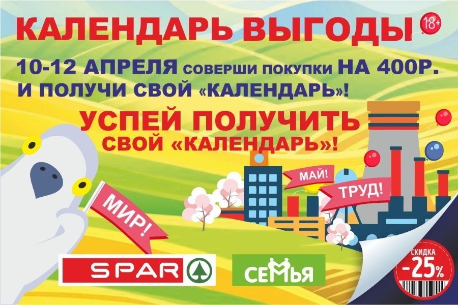Получить новый «Календарь выгоды» вы можете с 10 по 12 апреля включительно в любом из магазинов SPAR или «Семья» при суммарной покупке от 400 рублей.