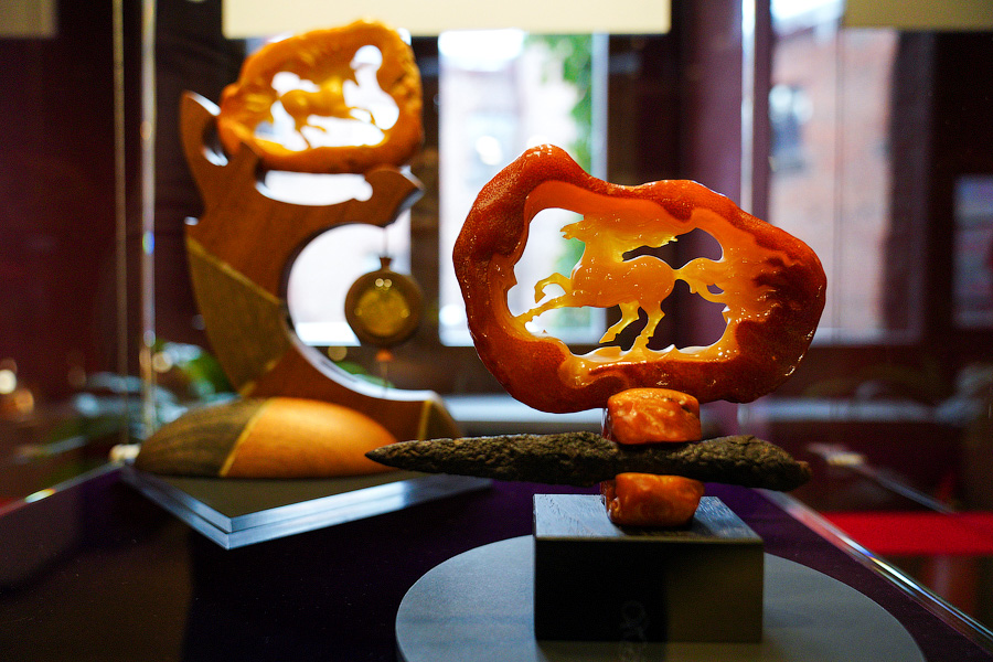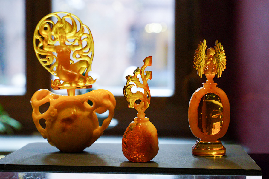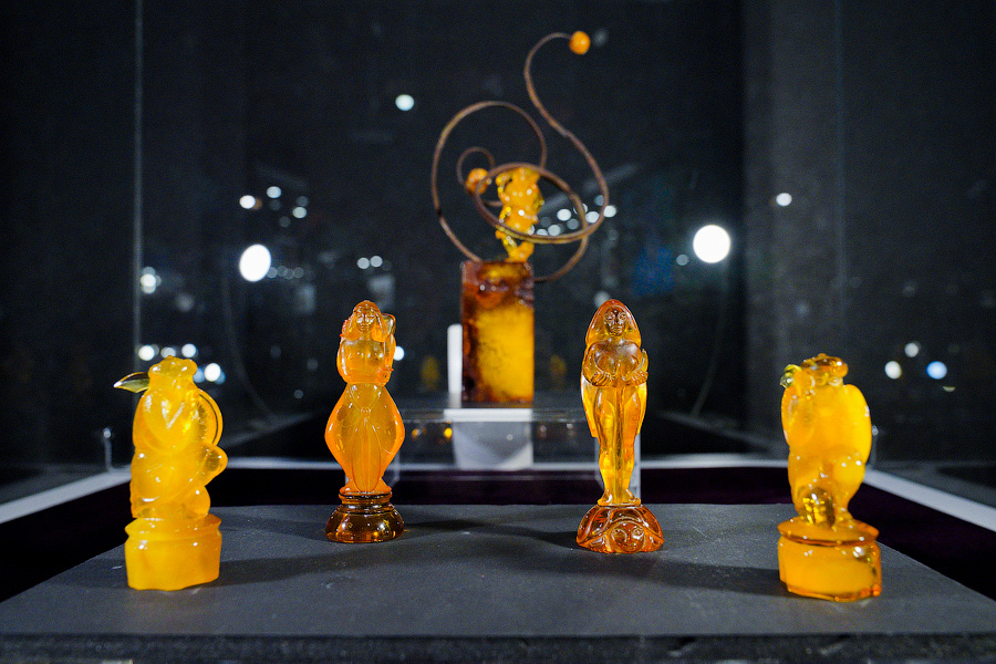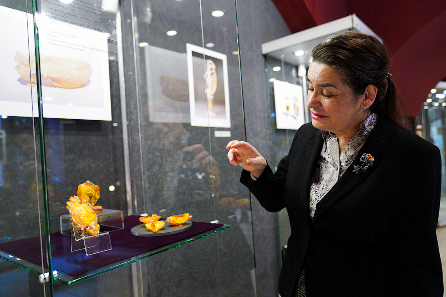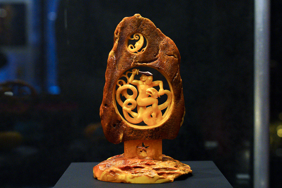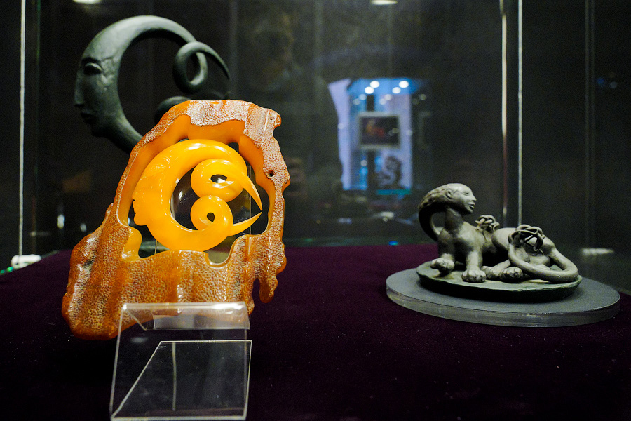 В результате удалось собрать, по сути, уникальную экспозицию, в которой представлены работы различных периодов творчества мастера, фотоснимки тех из них, судьба которых неизвестна, а также пластилиновые модели вырезанных в камне композиций — для наглядности и понимания того, как трансформировался художественный замысел автора при воплощении идеи непосредственно в янтаре, несколько из них размещено рядом с законченными произведениями.