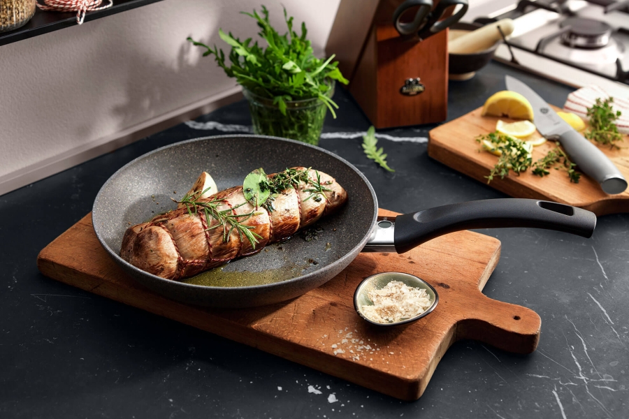 Cortina Granitium — большие и стильные сковороды, имеющие индикатор температуры на рукояти, который становится красным при нагревании и зеленым при охлаждени. Это позволяет узнать, в какой момент температура оптимальна для приготовления блюда с идеальной прожаркой! Эти сковороды также обладают антипригарным покрытием с минеральными частицами.
