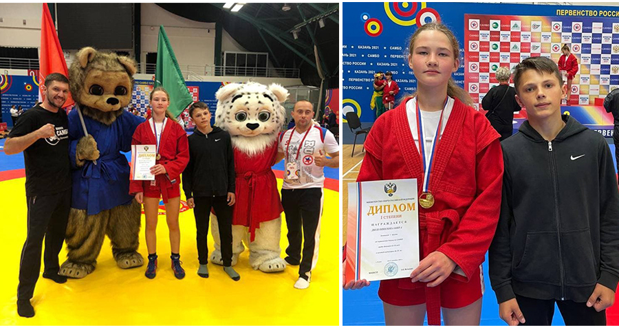 На фото: Дмитрий Бараненко — тренер Киры Долгополовой, Кира Долгополова — чемпионка России по самбо, Николай Бондаренко — чемпион России по самбо, Дмитрий Азаров — тренер Николая Бондаренко.