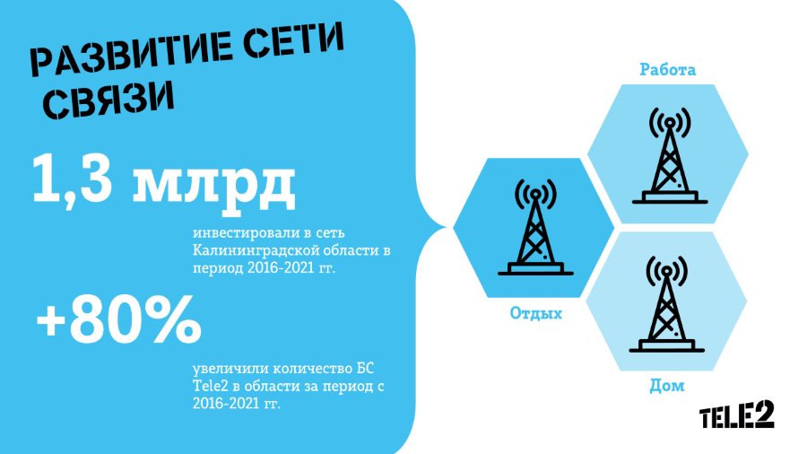 В 2021 году специалисты Tele2 проводили работы по улучшению качества мобильного интернета в целом ряде населенных пунктов региона, расширяя зону охвата и увеличивая емкость сети LTE в Советске, Светлом, Правдинске, Озерске, Нестерове, Краснознаменске и многих других населенных пунктах. Не стали исключениями и Калининград с пригородами, а также курортные города — дополнительные базовые станции построили вдоль побережья Балтийского моря. Понимая, что мобильный интернет — главная услуга, предоставляемая операторами мобильной связи своим абонентам мы даем возможность управлять ими. Пользователи могут через личный кабинет на сайте оператора: продавать минуты и гигабайты на «Маркете Tele2», делиться с друзьями и близкими. Кроме того, клиенты компании получили возможность обменивать накопленные на своих планах минуты на фильмы Wink и скидки при покупке смартфонов марки Xiaomi.