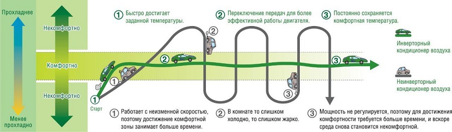 Старт-стопный (или классический) — компрессор работает периодически, при достижении заданной температуры выключается, и наоборот. Инверторный мотор компрессор — работает постоянно, меняет свою производительность в зависимости от нагрузки, тем самым поддерживает более точно температуру внутри помещения, имеет повышенный моторесурс по отношению к компрессору стартстопного типа. В магазине на Свердлова, д. 29А (кондиционеры39 «Оазис»), можно воочию оценить отличие старт-стопной технологии от инверторной.