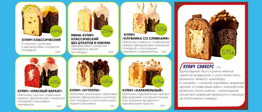 Особенно вкусные сдобные куличи, выпеченные на сливочном масле, с изюмом, цукатами вишни и апельсина, со сливочными и шоколадными начинками. Творожные пасхи и подарочные пасхальные пряники.Заказ пасхальной продукции по телефону 30-30-40