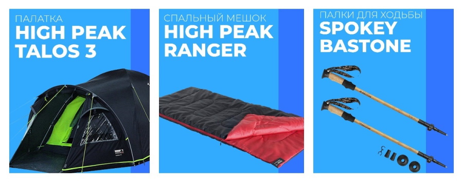 - Спальный мешок High Peak Range — теплый, вместительный, удобный.