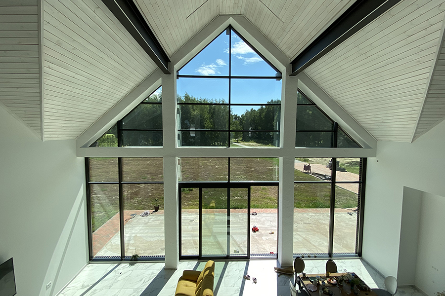 Благодаря высокой прочности алюминия и комплектующих существует возможность изготавливать панорамные окна от пола до потолка в несколько этажей и двери больших размеров — высотой до 3 метров и шириной до 6,5 метров, а также витражных конструкций различной степени сложности.