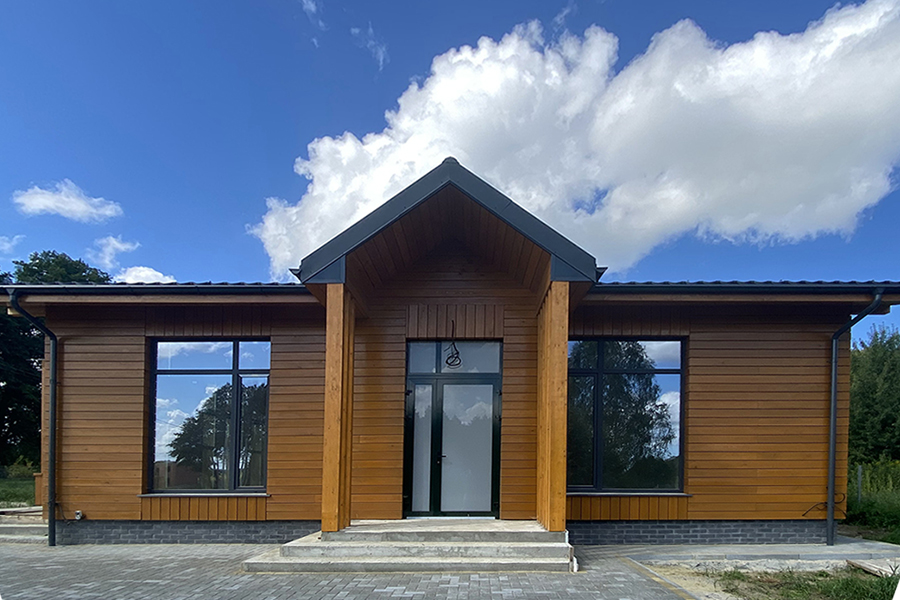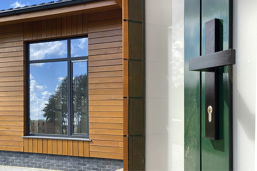 Каркасный дом с алюминиевой темно-зеленой дверью и пластиковыми окнами цвета «антрацит» — для тех, кто ценит чувство спокойствия, защищенности и приватную атмосферу.