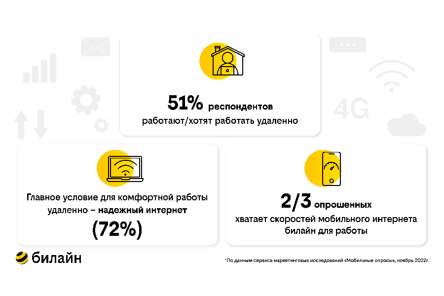 Почти 60% опрошенных клиентов «билайна» считают, что мобильный интернет может заменить проводной при работе в удаленном формате, поскольку его скоростей хватает для работы. Такой вывод можно сделать из результатов недавнего исследования «билайн», проведенного среди своих абонентов с помощью собственного сервиса маркетинговых исследований «Мобильные опросы»*.