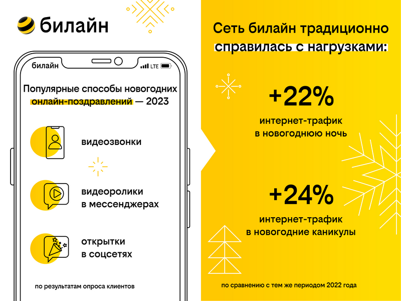 «Билайн» подвел итоги работы сети мобильной связи во время новогодних праздников в регионах России. Сеть оператора традиционно успешно справилась с нагрузками. При этом клиенты «билайн» существенно увеличили потребление мобильного интернета по сравнению с тем же периодом прошлого года.*