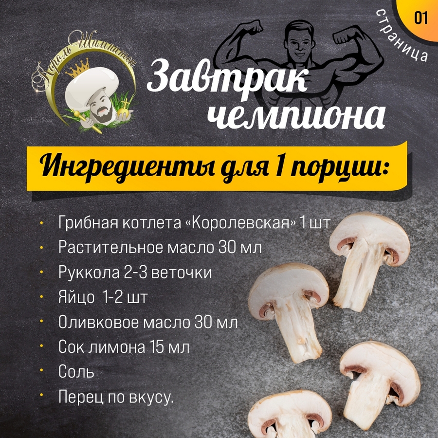 Очень часто шампиньоны становятся альтернативой мясу, а также они содержат фосфор и могут полноценно заменить рыбу. Грибные котлеты не содержат холестерина и генномодифицированных продуктов. Поэтому одинаково полезны и взрослым, и детям. Предлагаем рецепт «Завтрак чемпиона»: