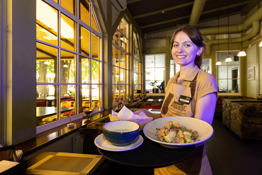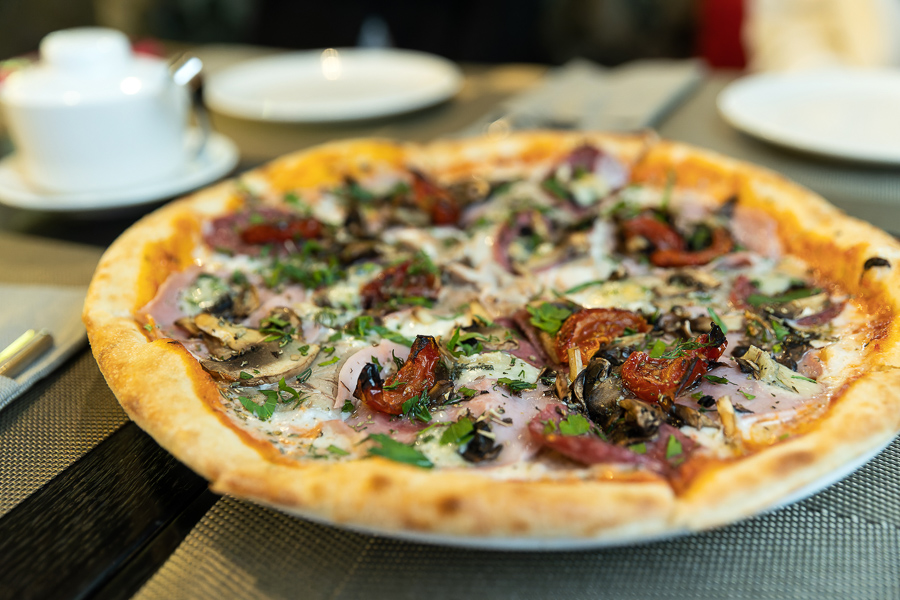 Часть нового ресторанного комплекса занимает пиццерия — просторное помещение, где легко разместиться хоть всей семьёй, хоть целой туристической группой. Меню здесь простое, но добротное. Если драники, то из фермерского картофеля. Сырные палочки — только собственного приготовления. Все соусы тоже делают на кухне с нуля. Что касается пиццы, если в ней вкусное тесто, то начинка может быть практически любой — главное, чтобы ингредиенты были качественными и свежими. Рецепт теста для пиццы «Курхауса» разрабатывали не один день тернистым путём проб и ошибок, и в итоге всё же вывели идеальную формулу. Получилось оно тонким, хрустящим снаружи и удивительно воздушным внутри.