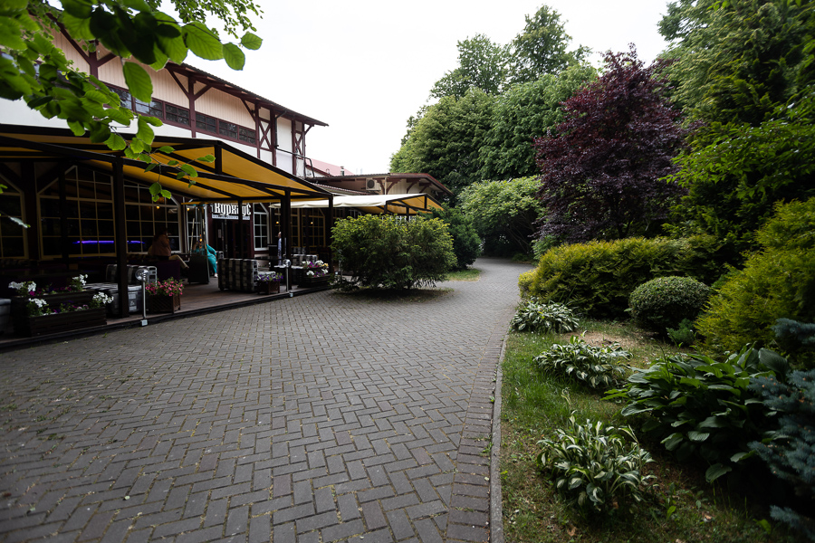 Теперь гостей наконец-то встречают официанты нового «Курхауса». Это комплекс, объединяющий семейный ресторан и пиццерию. На укутанной зеленью веранде — уютные диваны, мягкие пледы и много цветов. Все столики расположены под покатым навесом, так что можно любоваться садом с магнолиями и сакурами, не боясь промокнуть. Целый день здесь слышно пение птиц и шелест прибоя, а по вечерам на территорию то и дело забегают ёжики.