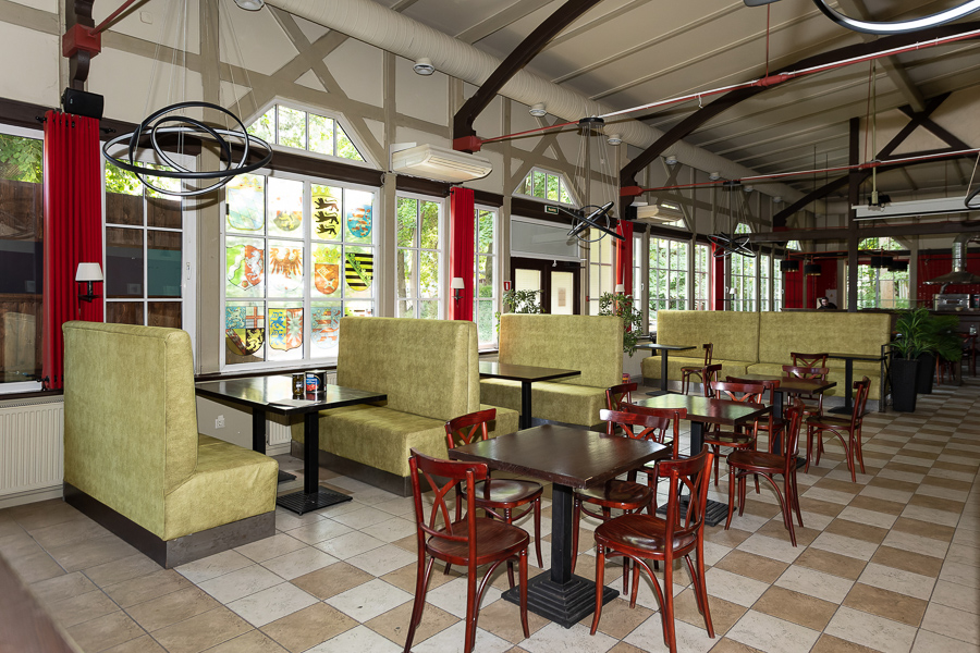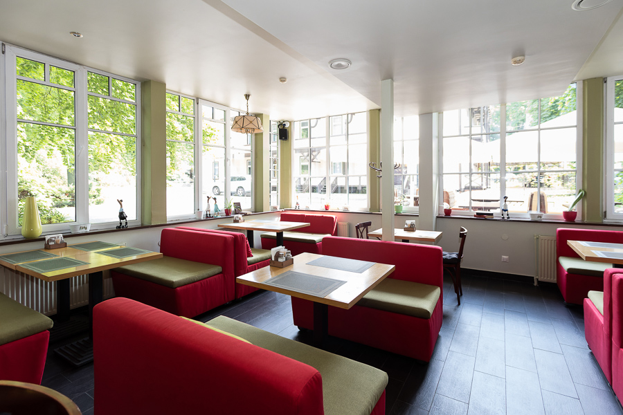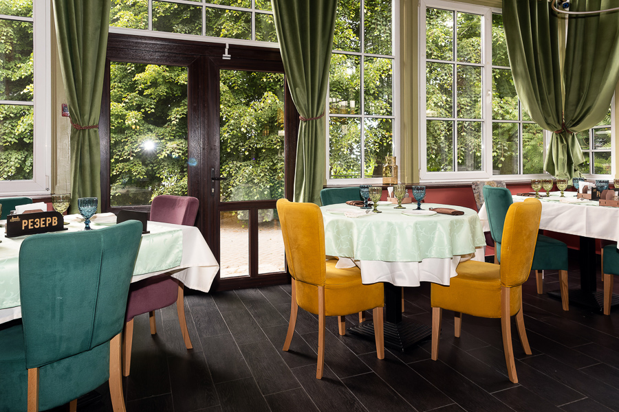 Интерьер «Курхауса» ненавязчив и скорее призван подчеркнуть архитектуру здания: перекрытия из натурального дерева, огромные окна с мелкой расстекловкой, сквозь которые солнечный свет заполняет всё пространство. В наследство от немцев заведению достался камин, его бережно подлатали и теперь мечтают разжигать зимними вечерами. Вообще ремонт здесь проводили хоть и в сжатые сроки, всего за полтора месяца, но вдумчиво, стараясь сохранить все аутентичные детали. Действовали по принципу «не навреди»: подправили, что сломалось, подкрасили, что выцвело. Забавно, что из-за ласточек, свивших гнездо в одной из стен, временно отключили один из кондиционеров, чтобы не нарушать покой птиц.