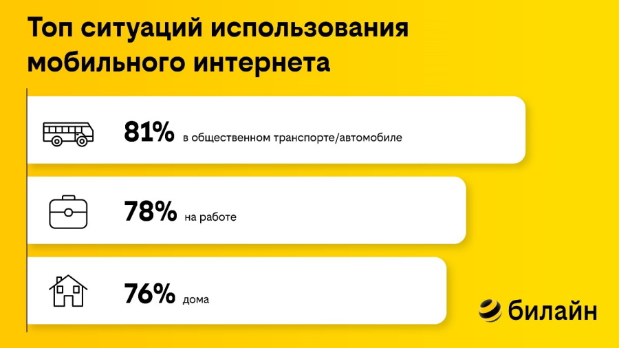 Оператор «билайн» провел опрос* среди своих клиентов, чтобы узнать, в каких ситуациях они пользуются мобильным интернетом. Самым популярным оказался вариант — при поездке в транспорте.