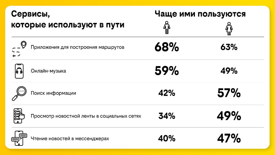 Интересно, что у респондентов разного пола и возраста наблюдаются достаточно заметные отличия в использовании онлайн-сервисов в транспорте. Так, женщины в пути значительно чаще, чем мужчины, просматривают новостную ленту в социальных сетях (49% и 34% соответственно) и публикуют там же фотографии и видео (37% и 26%). Мужчины в дороге чаще отдают предпочтение музыкальным онлайн-сервисам (59% против 49%).