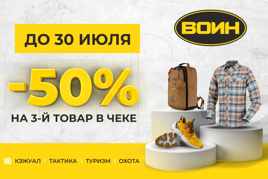 * Скидка 50% на 3-й товар действует в магазинах Калининградской области, не действует в интернет-магазине. Скидка распространяется на товар наименьшей стоимости. Акция не применяется, если на один из приобретаемых товаров уже выставлены другие акционные предложения. Подробная информация в магазинах «Воин».