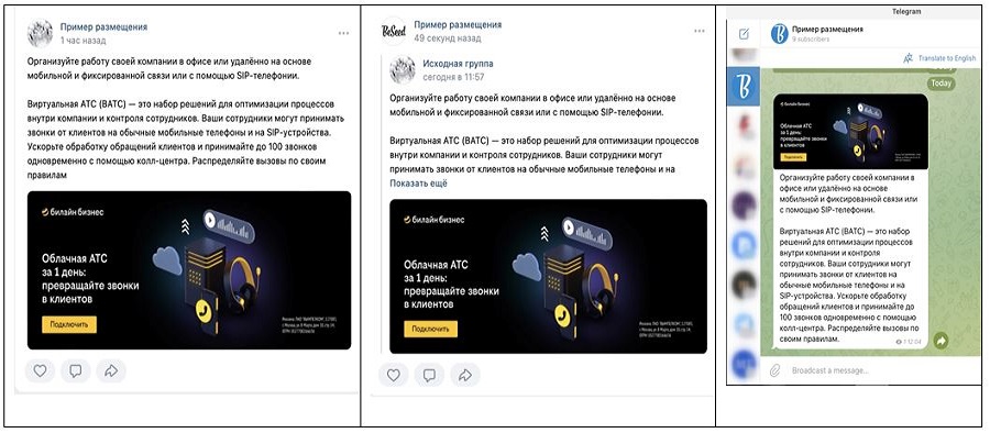 «Билайн adtech» — подразделение по рекламным технологиям «билайн бизнес» — обеспечил для бизнеса возможность размещения постов и репостов в социальных сетях через платформу «билайн.ПРОдвижение». Публикация постов возможна в Telegram, ВКонтакте и Одноклассниках. В сервис интегрирована регистрация в ОРД. Минимальный бюджет кампании — от 10 тыс. рублей с НДС. Для тарификации услуг применяется модель оплаты за показы.