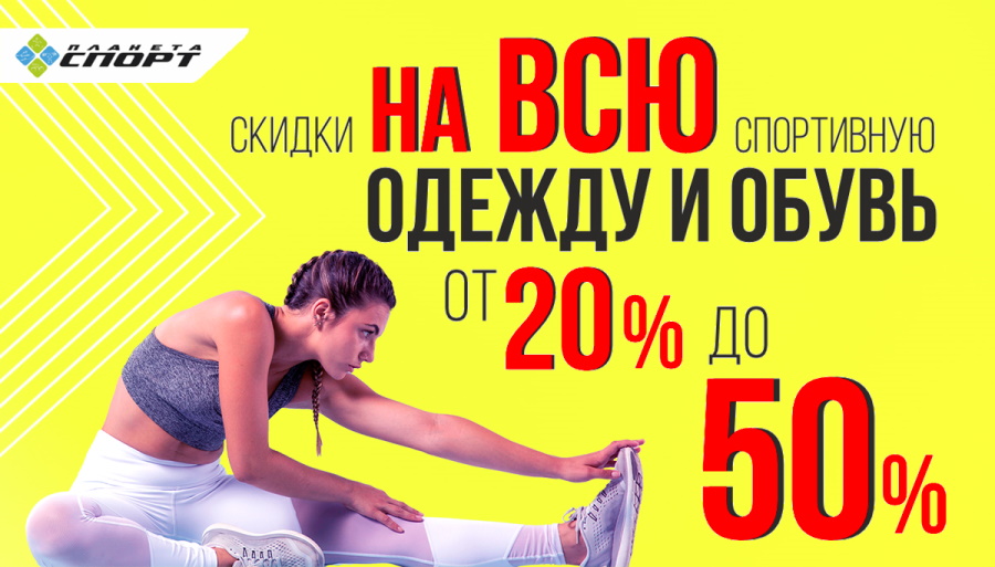 Если вы еще не начали активно заниматься спортом, то сейчас самое время обратить на это внимание. Ведь здоровье и физическая форма — это основа для успешной жизни. И чтобы мотивировать вас на старт, магазин «Планета Спорт» предлагает скидки на всю спортивную одежду и обувь от 20% до 50%!
