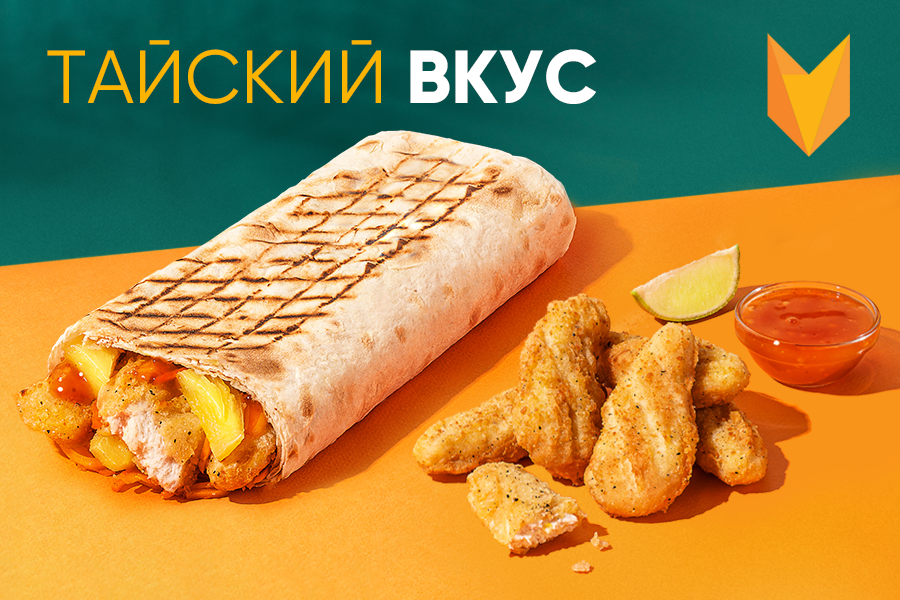 Возглавляет экзотическое трио Тайский дёнер. Сочный и ароматный, с куриными стрипсами, пряной морковью и ананасами в кисло-сладком соусе, он бесспорно покорит сердца и желудки как ценителей паназиатской кухни, так и любителей просто вкусно поесть. И стоит это астрономическое удовольствие всего 240 рублей.