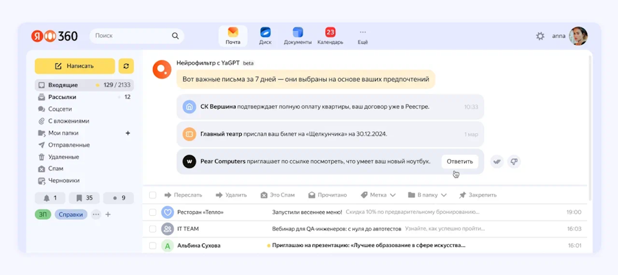 «В Почте уже есть инструменты, которые помогают поддерживать в почтовом ящике порядок — это правила обработки писем, фильтры, инструмент для управления рассылками и многое другое. Но поток входящих писем огромен, и случается, что люди всё равно упускают из виду что-то важное. Нейрофильтр с YandexGPT — комплексное решение, которое меняет привычные сценарии работы с Почтой. Больше не нужно подолгу разбирать ящик и кропотливо настраивать правила обработки писем — работу возьмёт на себя искусственный интеллект. В будущем мы планируем задействовать генеративные нейросети и в других сервисах нашей платформы», — говорит технический директор «Яндекс 360» Алексей Петроченко.