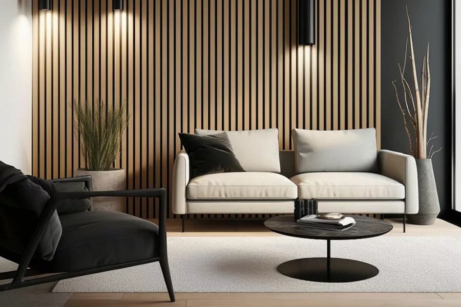 Акустические панели в последнее время приобрели популярность в Европе. Этот материал выбирают те, кто стремится повысить качество жизни и создать удобство для близких. В помещениях с плохой акустикой возникает реверберация, которая может снижать концентрацию внимания, ухудшать понимание речи и приводить к головным болям. Акустические панели позволяют избежать этих проблем. Они представляют собой реечные конструкции, в основе которых — войлок черного цвета толщиной 9 миллиметров. Этот материал эффективно поглощает звуковые волны, устойчив к влаге, воздухопроницаем и не требует дополнительного ухода. Панели отделаны рейками из мебельного МДФ, покрытого натуральным шпоном либо шпоном файн-лайн, который имитирует не только внешний вид, но и фактуру материала из ценных пород древесины.