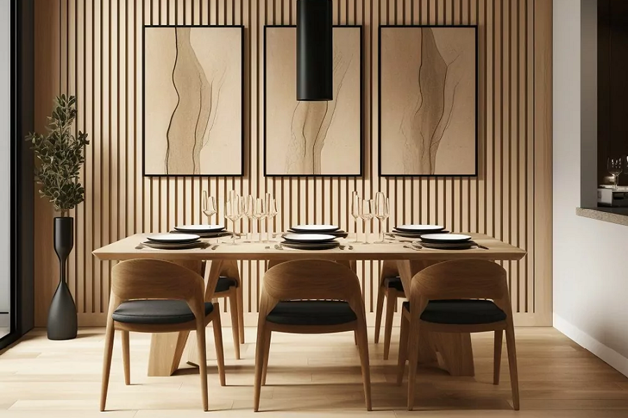 Акустические панели в последнее время приобрели популярность в Европе. Этот материал выбирают те, кто стремится повысить качество жизни и создать удобство для близких. В помещениях с плохой акустикой возникает реверберация, которая может снижать концентрацию внимания, ухудшать понимание речи и приводить к головным болям. Акустические панели позволяют избежать этих проблем. Они представляют собой реечные конструкции, в основе которых — войлок черного цвета толщиной 9 миллиметров. Этот материал эффективно поглощает звуковые волны, устойчив к влаге, воздухопроницаем и не требует дополнительного ухода. Панели отделаны рейками из мебельного МДФ, покрытого натуральным шпоном либо шпоном файн-лайн, который имитирует не только внешний вид, но и фактуру материала из ценных пород древесины.