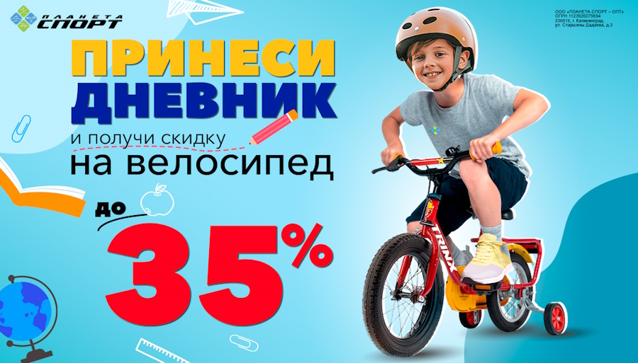 Акция действительна во всех магазинах «Планета Спорт», в том числе в интернет-магазине. Акция распространяется только на велосипеды. Скидка по акции не суммируется с другими скидками, акциями, спецпредложениями и скидками по купонам. Бонусы при совершении покупки не используются, но накопления идут. Если товар уже с акционной ценой, то он участвует в акции «Принеси дневник», но по полной розничной цене.