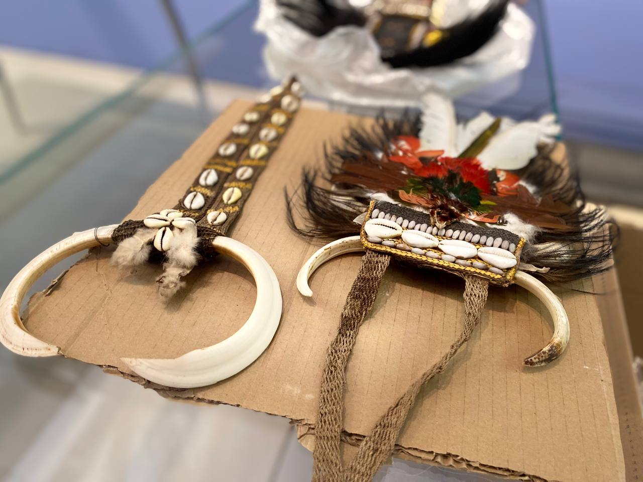 Другой раздел выставки посвящен домонетному периоду. В экспозиции представлены беличьи и куньи шкурки, раковины морских моллюсков, перья редких птиц, украшения — предметы, которые когда-то люди использовали в качестве обменной валюты.